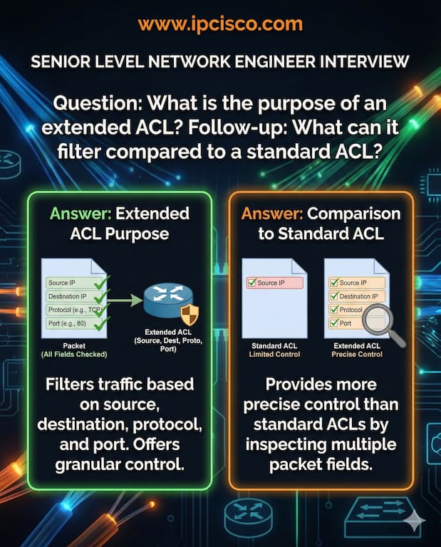 An extended ACL (Access Control List) is used to provide granular traffic filtering and security control in a network. Unlike a standard ACL (which only filters based on source IP address), an extended ACL can filter traffic based on source and destination IP addresses, protocols (TCP, UDP, ICMP) and port numbers.