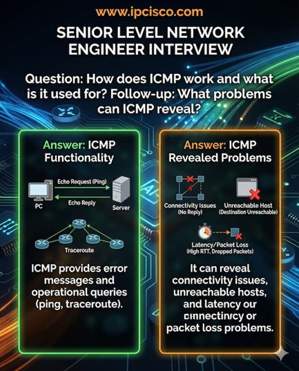 An IP address is a unique identifier used to locate and communicate with devices on an IP network. ICMP (Internet Control Message Protocol) is used for network diagnostics and error reporting (e.g., ping, traceroute). ICMP helps reveal issues like packet loss, latency, unreachable hosts/networks, routing problems and TTL expiry.